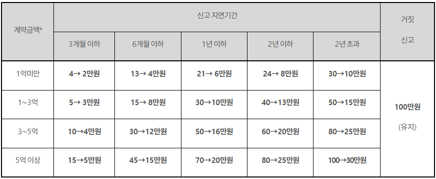 | 제재사항 | 신고 의무 위반 시 2만원에서 최대 30만원 이하의 과태료(‘25. 6. 1. 시행) (단 거짓신고는 100만원) ※ 계도기간(‘21.6.1.~’25.5.31.) 중 체결된 계약은 과태료 부과대상에서 제외되며, ‘25.6.1.이후 체결된 계약부터 과태료 부과됨 |