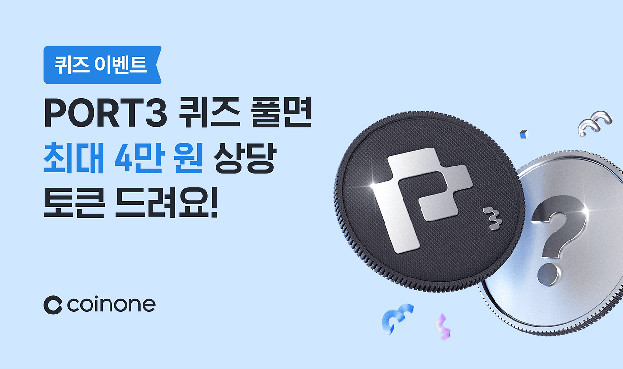 안녕하세요 코인원입니다.PORT3 퀴즈 이벤트를 진행합니다.PORT3 퀴즈 이벤트이벤트 기간: 2025.6.2.(월) 18:00 ~ 2025.6.3.(화)(단, 예산 소진 등의 사유로 조기종료 될 수 있습니다.)혜택: 이벤트 코드에